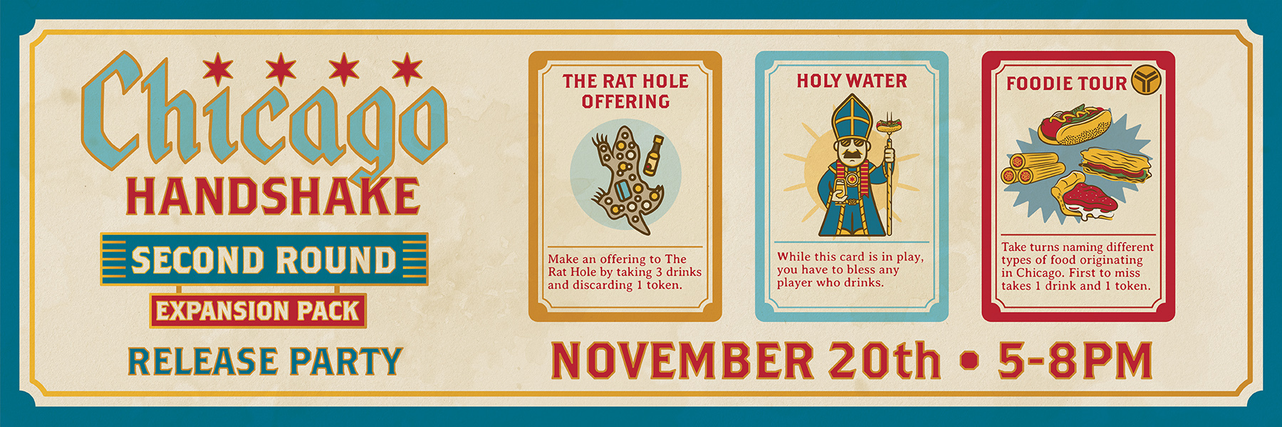 Guests will be the first to see and play the new expansion deck. The Second Round introduces new challenges, fresh humor, and even more ways to prove you can handle a proper Chicago Handshake. It is designed to work alongside the original game to add variety for players who already love it, but it can also be played without the original deck for a completely fresh take on the classic.